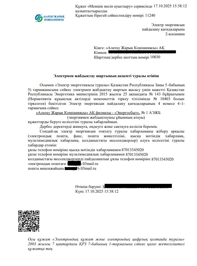 Жасалған өтінім «Алатау Жарық Компаниясы» АҚ Филиалы - «ЭнергоСбыт» қызметкерлерінің қарауына келіп түседі.