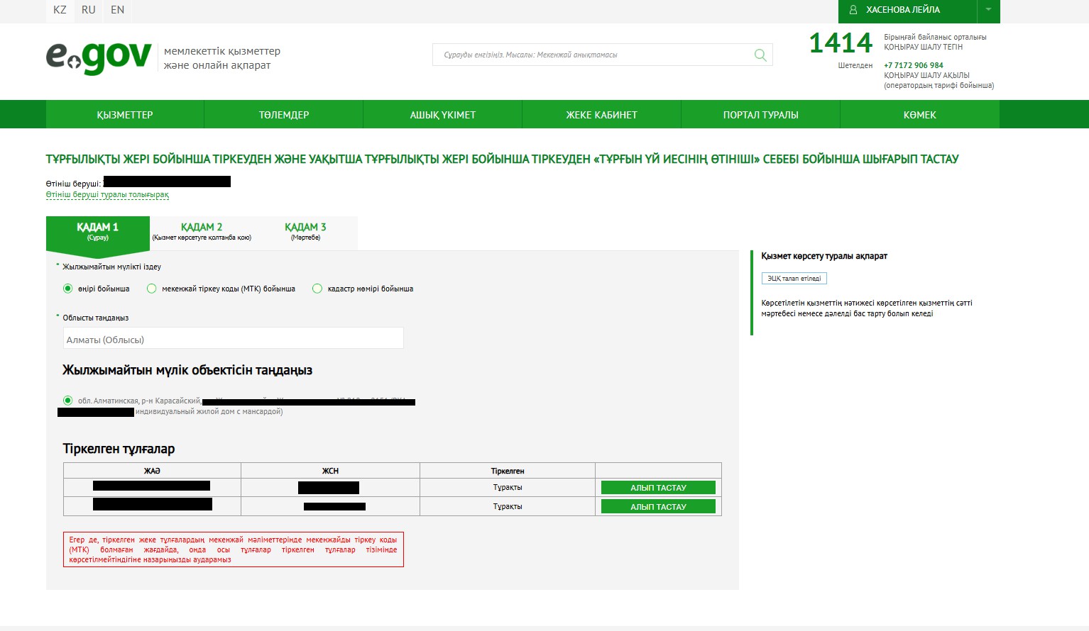 - kz-тегі Жеке кабинетте жылжымайтын мүлікте тұратындардың/тіркелгендердің санын растауы бар экранның скриншоты (Жеке кабинеттің жоғарғы бөлігінде).