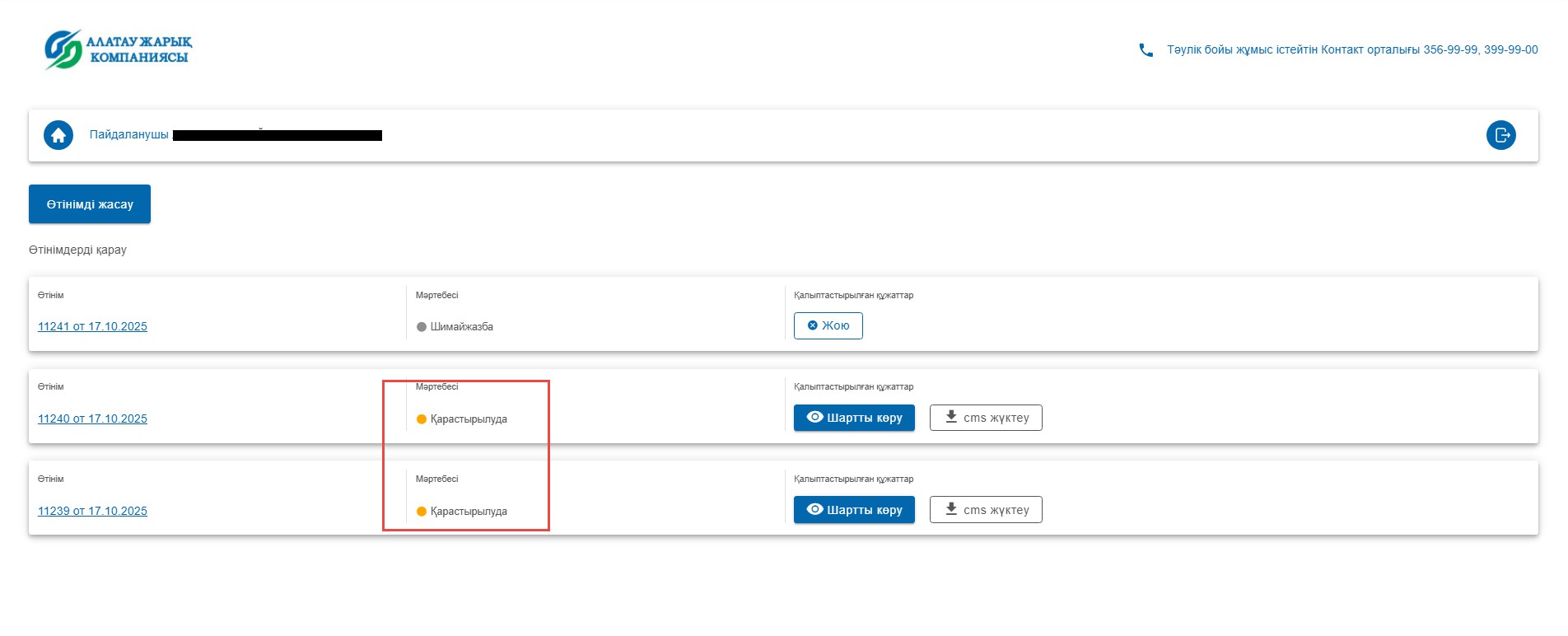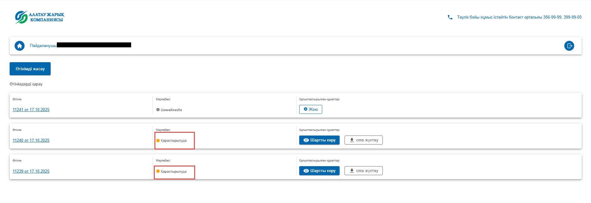 - Өтінімнің жағдайы;
