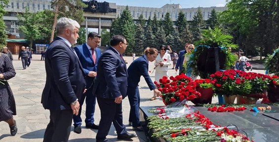 Қатысушылар Мәңгілік алауға гүл шоқтарын қойып, бір минут үнсіздікпен өз Отанын және ұрпақтарының бейбіт болашағын қорғаған боздақтарды еске алды.
