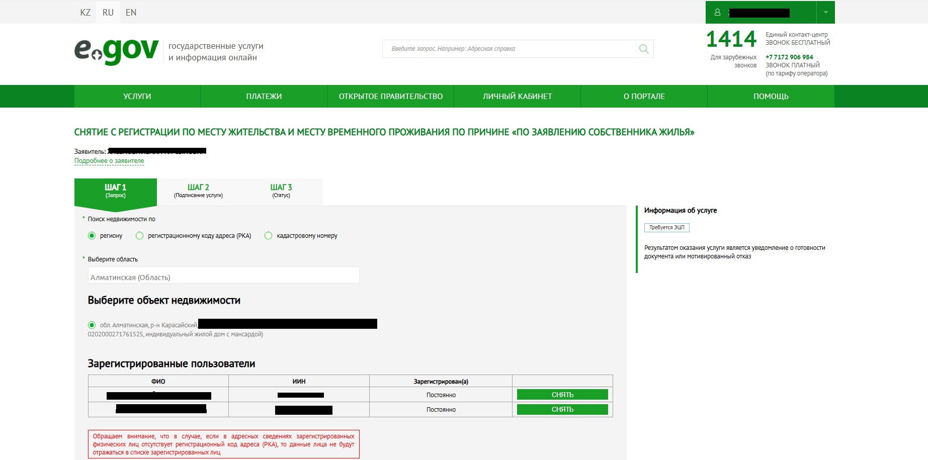 Обратите внимание, первоначально для получения данного документа собственнику жилья необходимо зайти на портал eGov.kz, затем выбрать функцию «Услуги», далее в разделе услуг открыть объект «Гражданство, Миграция и Иммиграция» и из отображенного списка выбрать «Снятие с регистрации по месту жительства населения Республики Казахстан» (в крайней правой колонке). В результате вы перейдете на следующую страницу, где нужно выбрать в правом верхнем углу функцию «Заказать Услугу онлайн». При помощи электронно-цифровой подписи подтвердить запрос. Следующим шагом будет выбор «области» и «адреса». В результате получите адресную справку, к которой прилагается список «Зарегистрированных физических лиц» по выбранному объекту недвижимости. Достаточно приложить скриншот с окна Личного кабинета где отображается список «Зарегистрированных физических лиц» по выбранному объекту недвижимости.