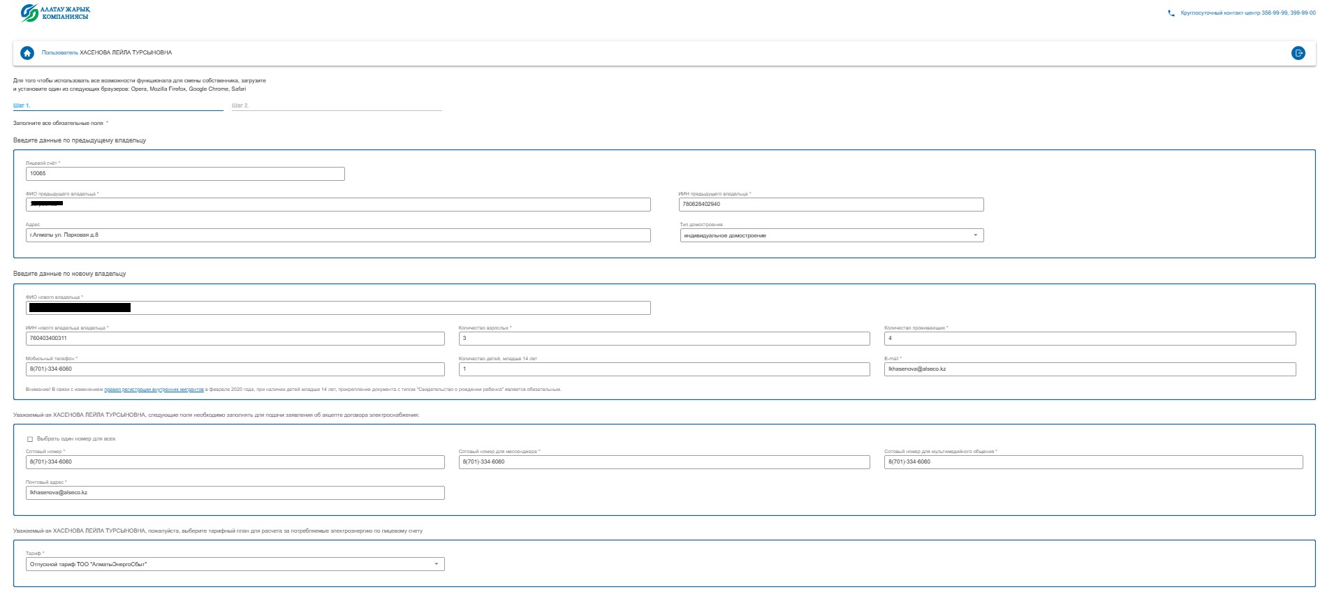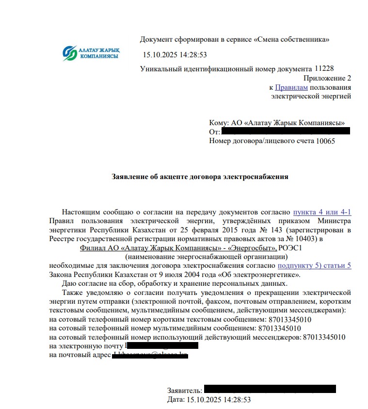 Далее на электронную почту потребителя будет отправлено уведомление об успешном приема онлайн заявки по смене собственника (с эл.адреса treatyonline@esalmaty.kz)