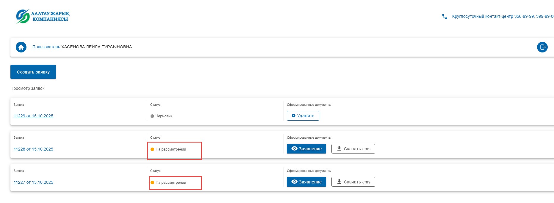 Созданная заявка поступает на рассмотрение работникам Филиал АО «Алатау Жарық Компаниясы» - «ЭнергоСбыт».